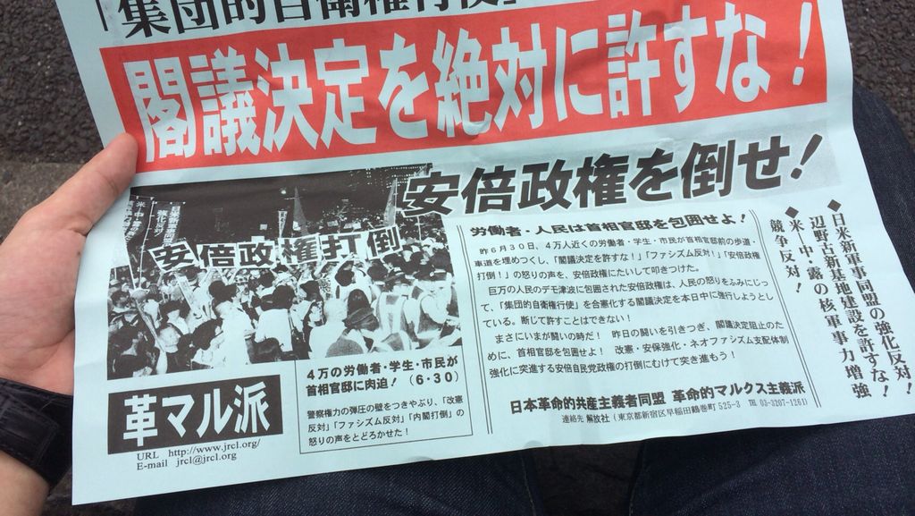 >「解釈改憲もうヤメロ」などと書かれたプラカードを掲げ、