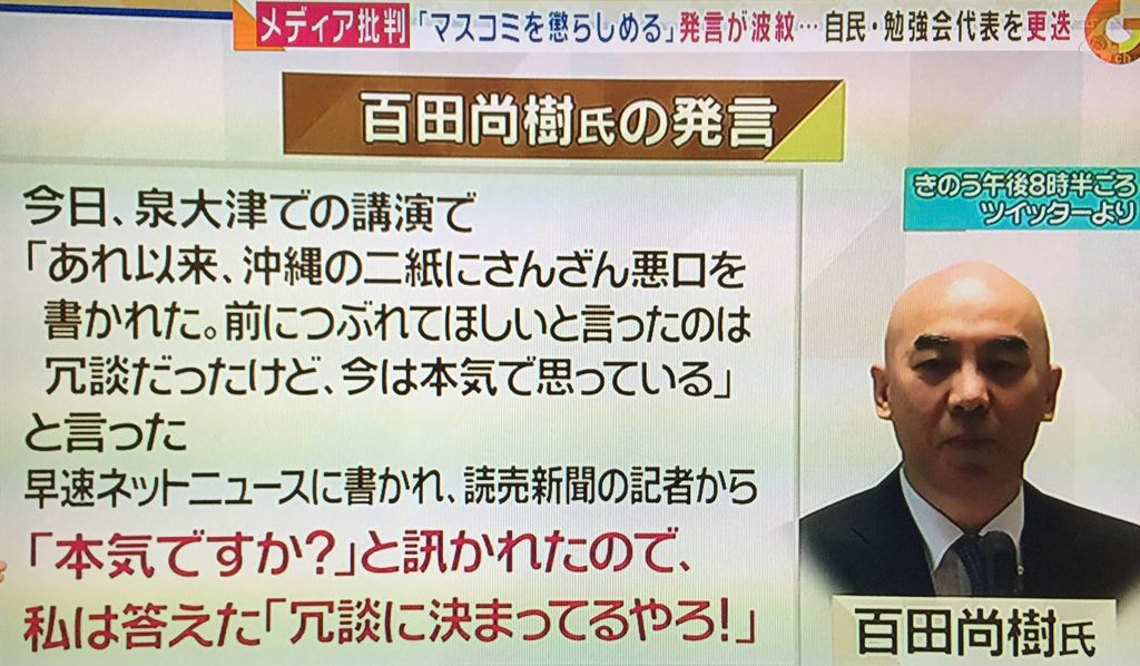 私が沖縄の二紙に対して「つぶれろ♪」と発言したものだから、朝日新聞、毎日新聞、東京新聞その他の新聞、テレビ局なども、一斉に百田尚樹攻撃!