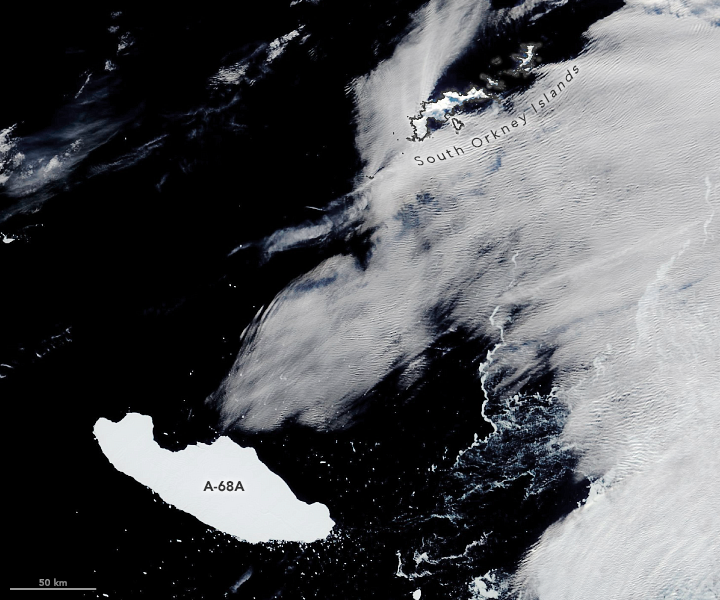 「A-68A」の正式名をもつこの氷山は、2017年9月に南極大陸のラーセン棚氷からはがれ落ちて以来、北に向かって蛇行しながら漂流を続けていた。全長94マイル(約151km)、幅30マイル(約48km)ほどの「A-68A」はサウスジョージア島全体とほぼ同じ大きさで、このままでは20年12月ごろ島にぶつかると見られている。